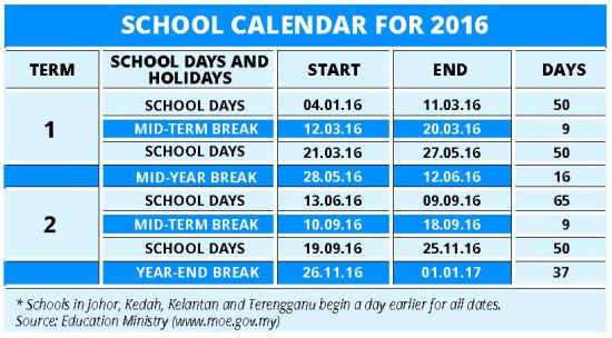 Sesi Persekolahan 2016 akan bermula pada 03012016 Ahad bagi negeri Kedah Johor Kelantan dan Terengganu. Keputusan ujian sekolah rendah 2016. Tarikh tutup permohonan.